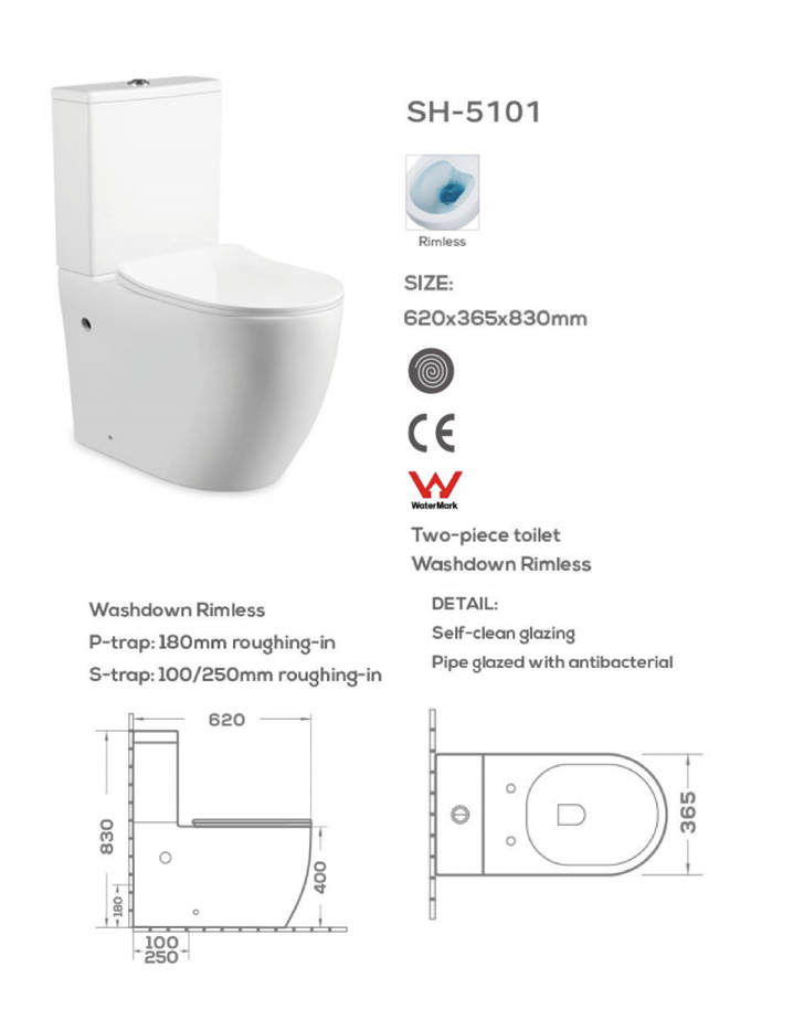 - Hocheffiziente rahmenlose Technologie: Das randlose Design ist der Hauptgrund für die Beliebtheit des SH-5101. Es bietet eine 360-Grad-Spülung, die jeden Zentimeter des Beckens erreicht. Dadurch werden Bakterienfallen vermieden und der Bedarf an scharfen chemischen Reinigern reduziert.