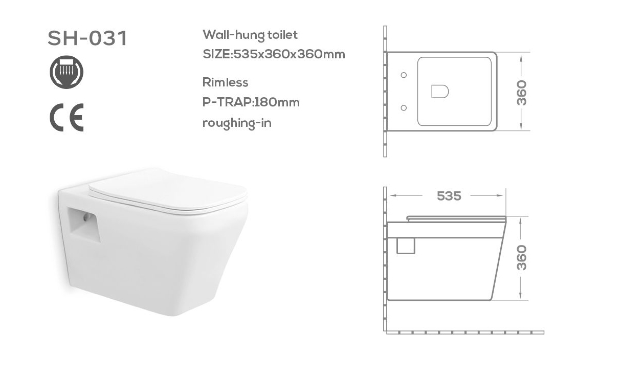 卸売ウォールトイレSH-031は、固定ボルトを簡単に取り付けることができる一体型の側面開口部を備え、設置プロセスを簡素化するため、大規模な建築プロジェクトや商業開発で好まれる選択肢となっています。SH-031は、シンプルでミニマルな四角いシルエットを誇り、壁に取り付けるデザインで貴重な床面積を節約できるため、狭いバスルームやモダンで美しいバスルームを目指す方に最適です。.