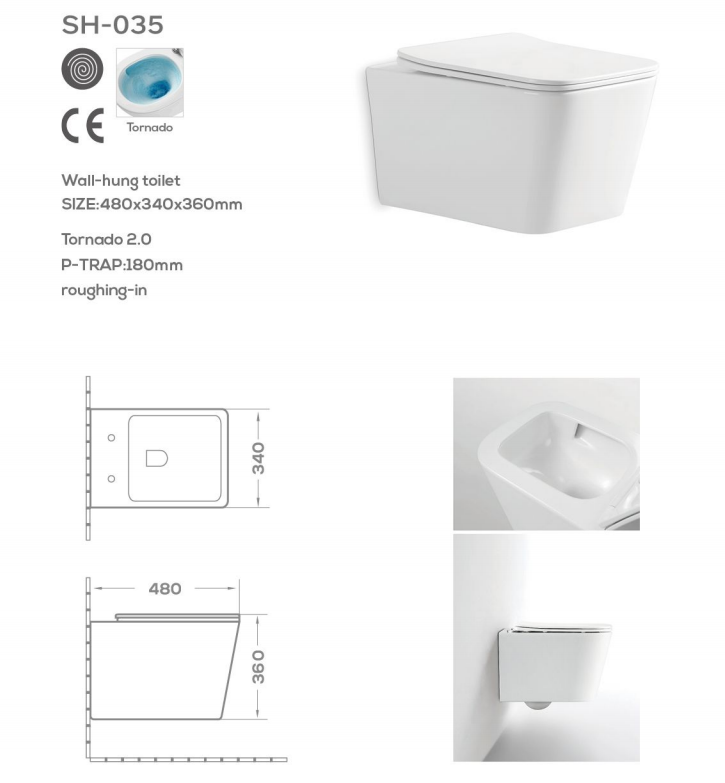 トルネード水洗角型壁掛けトイレ SH-035 - 隠し水洗穴付き