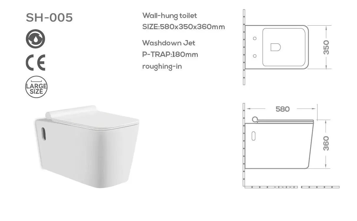 - 省スペース&スタイリッシュ: SH-005壁掛け便器は、洗練されたスクエアなフロントデザインが特徴で、モダンなバスルームを完璧に引き立てます。.