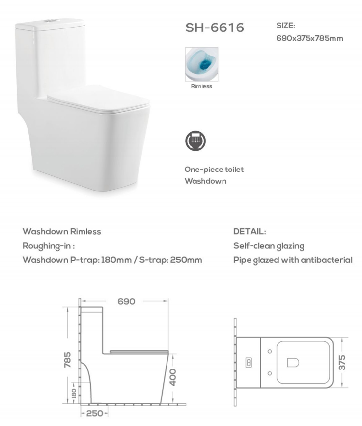 Wholesale one-piece toilet. The SH-6616 features a sophisticated rimless design, which eliminates the traditional inner rim where bacteria and limescale typically accumulate. This “Washdown Rimless” technology, paired with our proprietary self-clean glazing, ensures a high-velocity flush that covers every inch of the bowl while maintaining water efficiency.