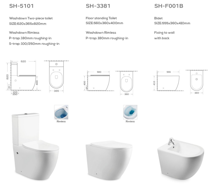 Wholesale Bathroom Suite with Factory Price – One Piece Toilet, Wall Hung Toilet and Bidet Set SH-5101 / SH-3381 / SH-F001B