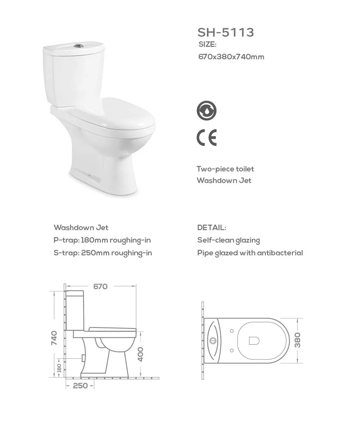 Engineered for modern bathrooms and commercial projects, the SH-5113 toilet combines superior hygiene with powerful performance. Its self-cleaning glazed surface and antibacterial piping reduce stains, bacteria, and odors, ensuring long-lasting cleanliness. Contact us for a quote.