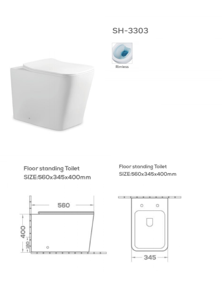 Our wholesale SH-3303 rimless floor standing toilet is a strategic product choice for B2B buyers looking for a balance between modern design and reliable performance. Featuring a hygienic rimless structure and an efficient washdown flushing system, it meets the growing market demand for easy-to-clean, contemporary bathroom solutions.