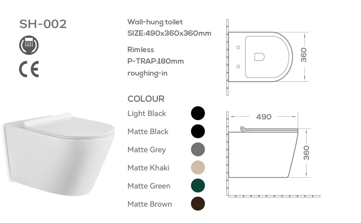 Настенные подвесные унитазы без ободка оптом - прямые поставки с завода. Безободковый подвесной туалет SH-002 идеально подходит для городских жилых комплексов с высокой плотностью застройки. Он также хорошо работает в гостиничном секторе: его “плавающая” конструкция способствует быстрому мытью пола, а безободковая чаша обеспечивает превосходные стандарты гигиены в номерах отелей. Свяжитесь с нами, чтобы узнать цену.